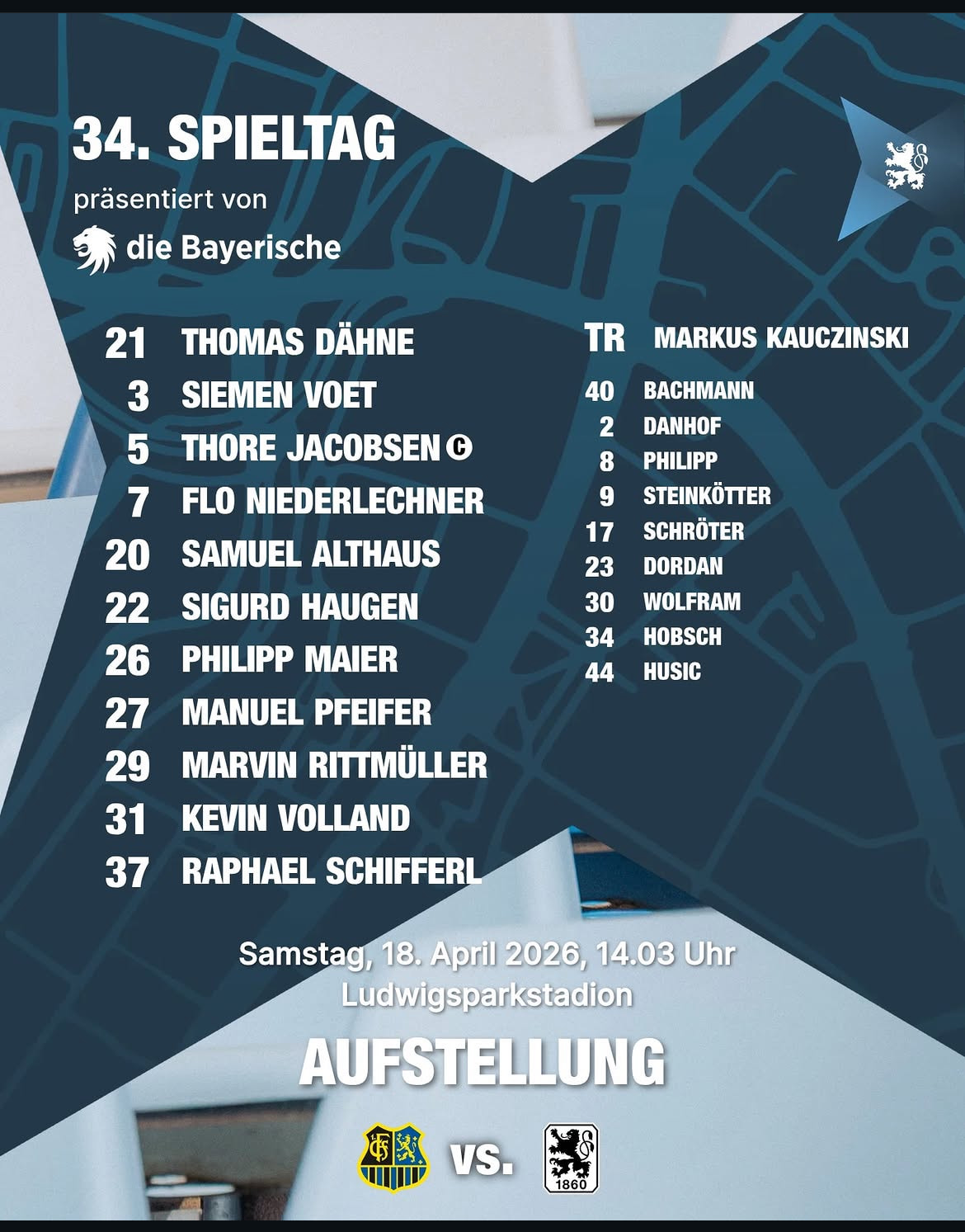 Für unsere Jungs geht es darum die Saison ordentlich zu Ende zu spielen und mal wieder einen Auswärtssieg zu holen. Ich könnte mir vorstellen das Kauczinski mit der gleichen Mannschaft beginnt wie gegen Regensburg. Falls Reinthaler nicht kann spielt Schifferl und evtl. gibt man Schröter noch einmal die Möglichkeit sich für Rittmüller zu zeigen. Danhof ist natürlich auch eine Option auf Rechts.
