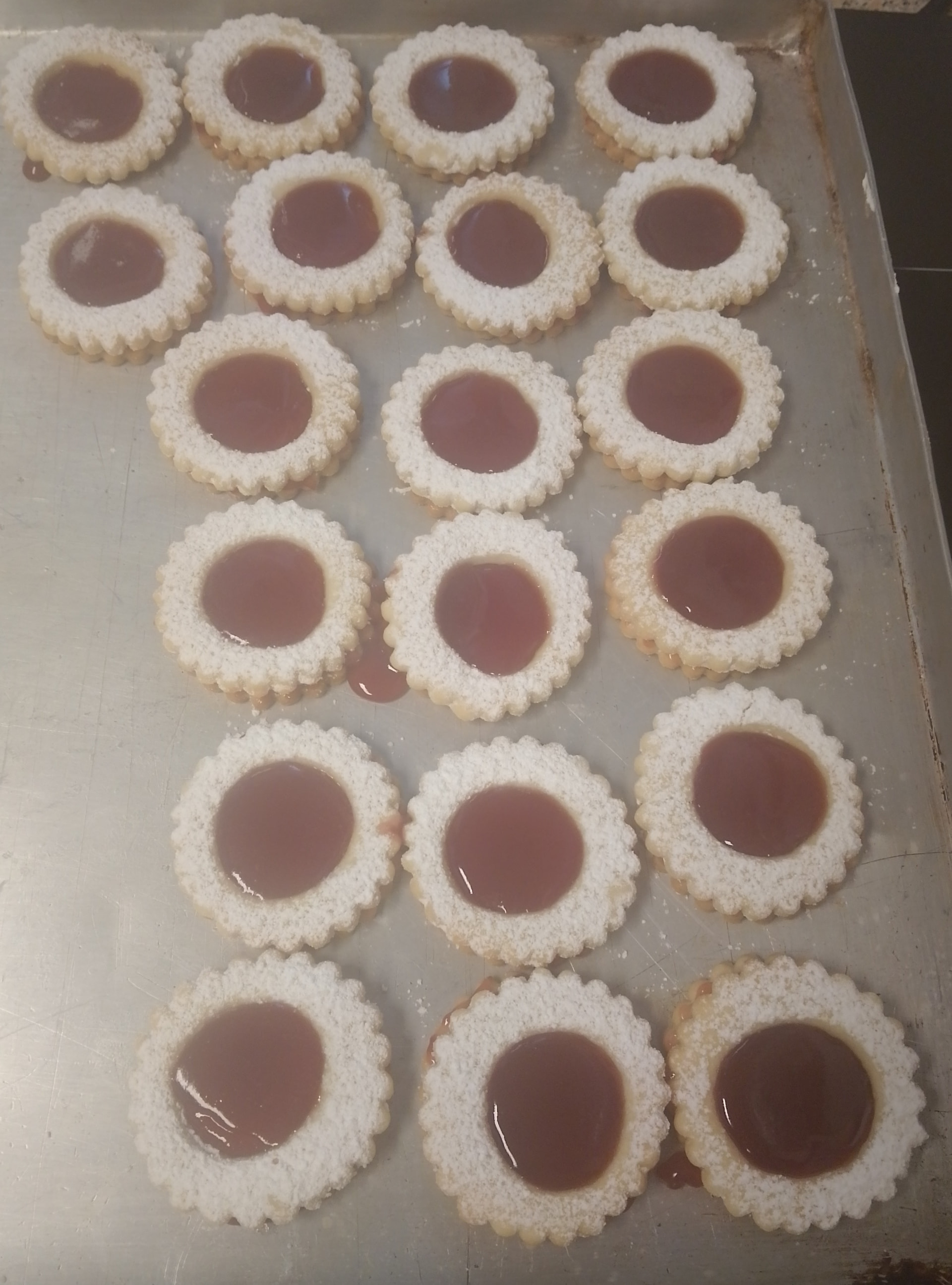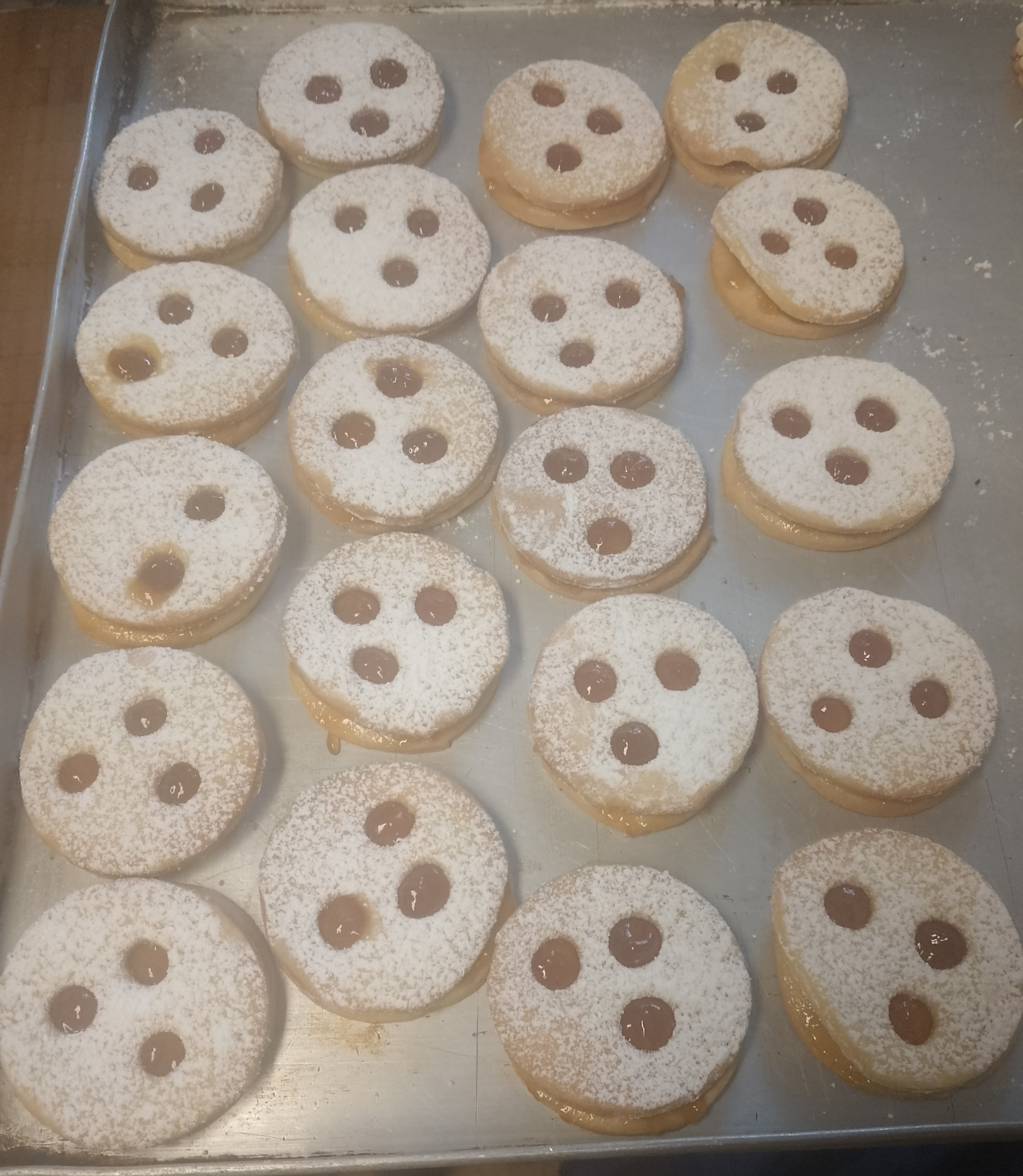 Husarenkrapfen, Zitronenstangen, Himbeer-Marzipan-Plätzchen, Nougatkugeln, Arrak-brezeln, Nußtaler usw.