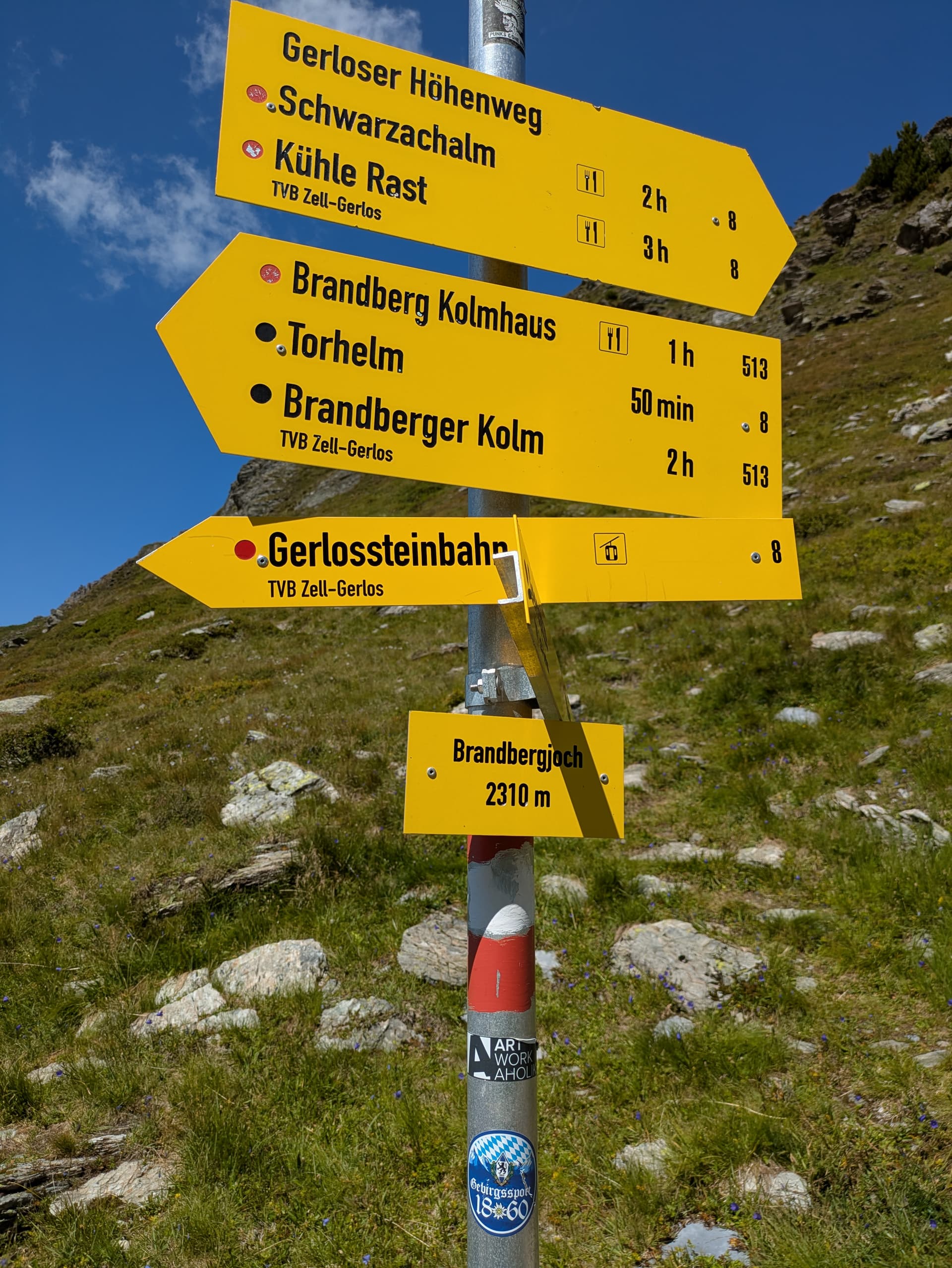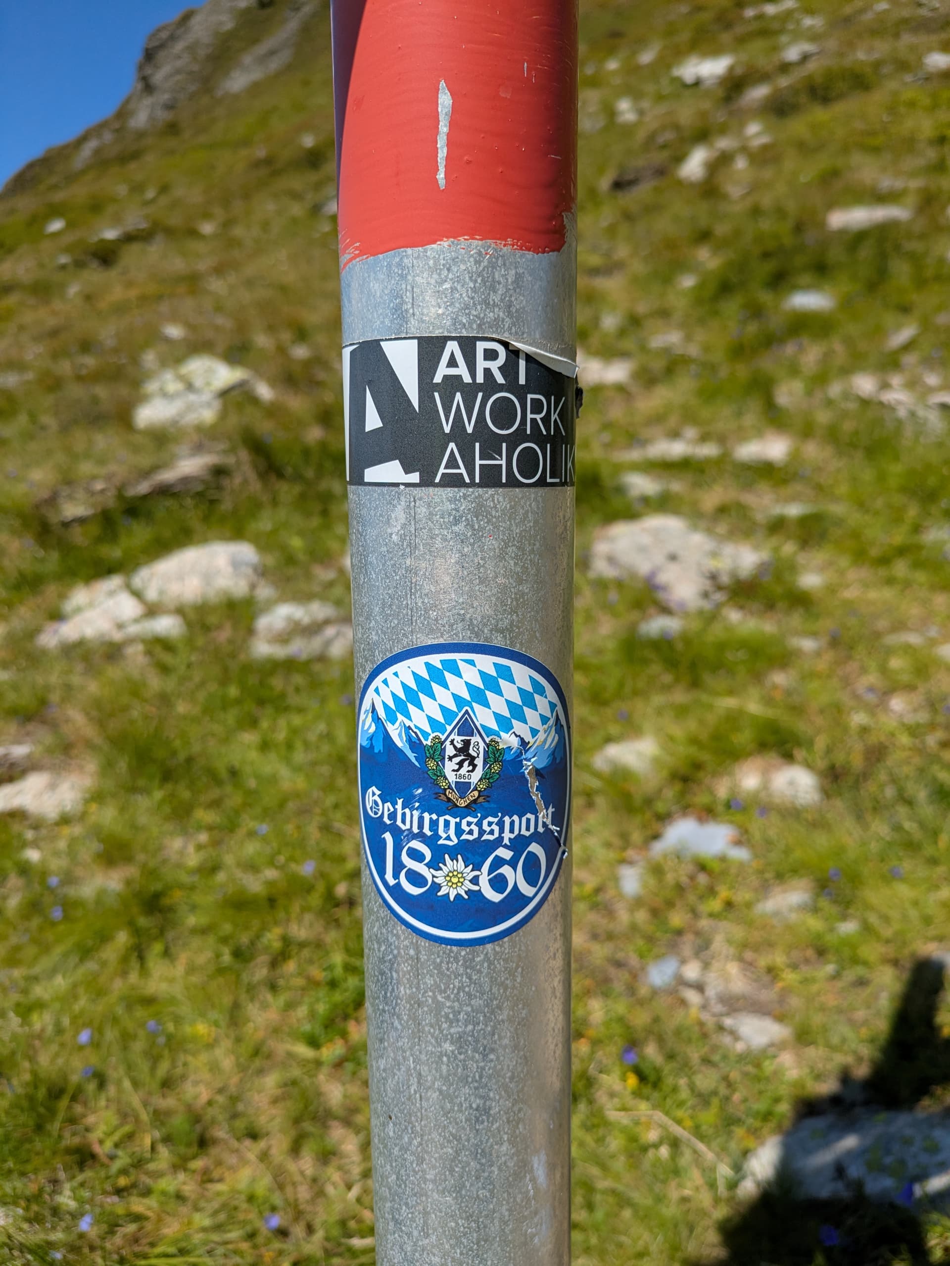Den Bergsteiger-Riege Aufkleber (nach dem Schild an der Hütte am Blauen Gumpen) hat der “Schwiegersohn” von der Barbara machen lassen.