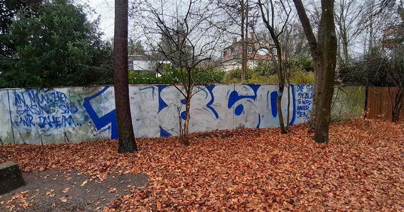 Anscheinend waren ein Teil der Flächen vorher von rotem Graffiti überzogen.