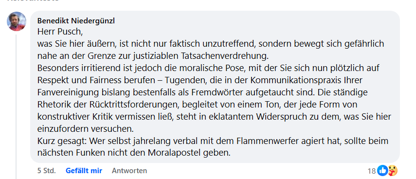 willkommene Chance für Hr. Pusch, bisserl auf den Putz zu klopfen und die schwer getroffene Leberwurst zu spielen; was dieser „Elefant im Löwen-Porzellanladen“ komplett ausblendet, ist das Sprichwort vom Wald und Echo oder das mit der eigenen Türe und dem Kehren…